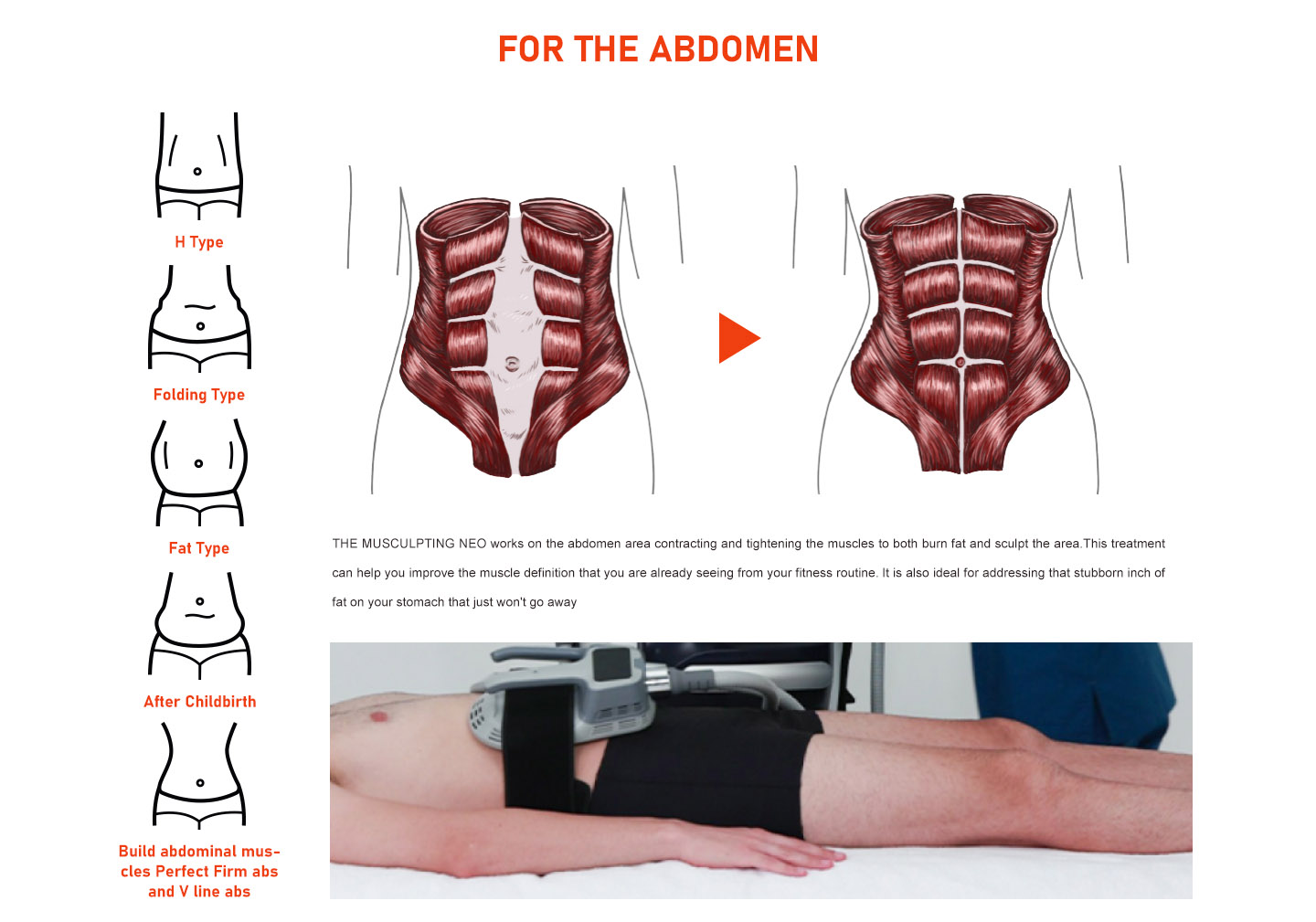 With high intensity electromagnetic wave focusing technology, MUSCULPTING can continuously trigger super strong muscle contraction to achieve high frequency extreme training, which can approach 100% muscle fibre activity, compared to 20-30% with normal exercise.The super-strong muscle contraction requires a lot of energy to maintain, thus breaking down a large number of fat cells, achieving fat loss.