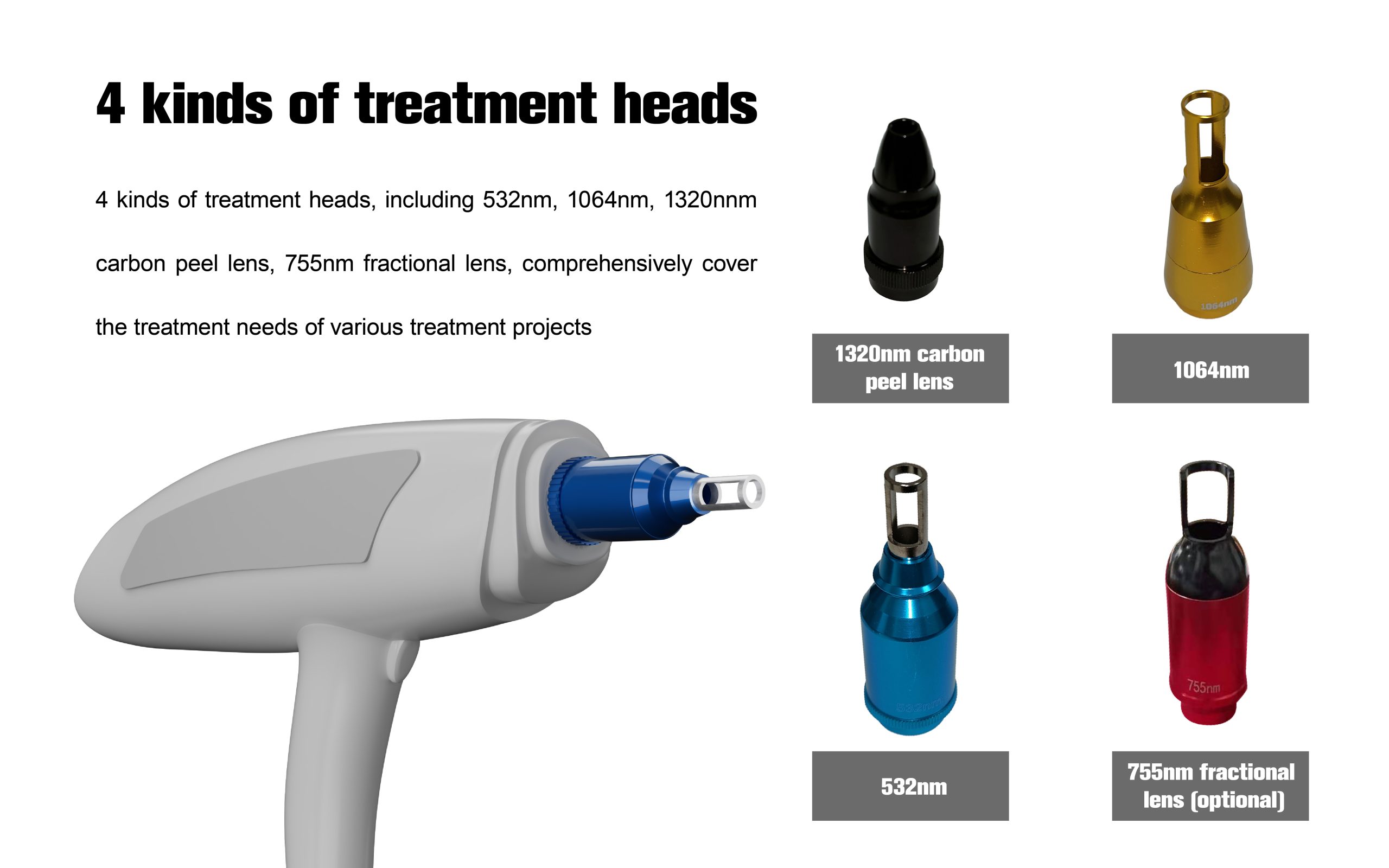 The four different kinds of handles cover a wide range of treatments including tattoo removal, skin dullness improvement, skin rejuvenation, acne removal and blackhead removal, etc.