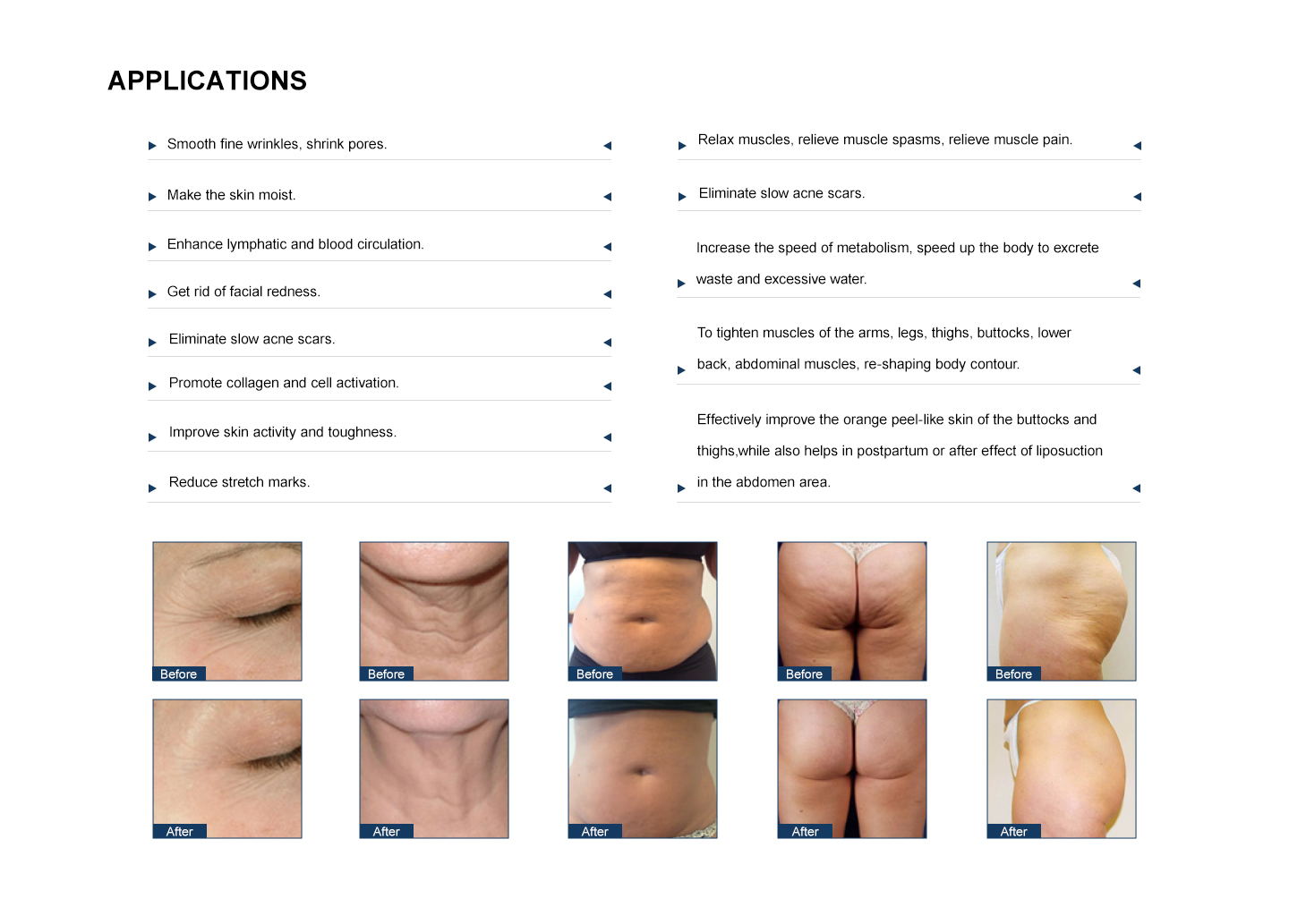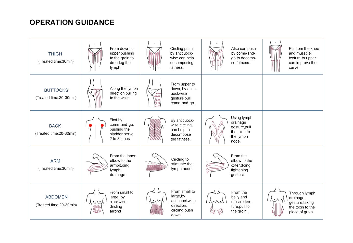 After break up the subcutaneous fat, decrease cellulite accumulation. It helps smoothlymph and discharges the fattyacid and toxin that isdecomposed through lymph system.